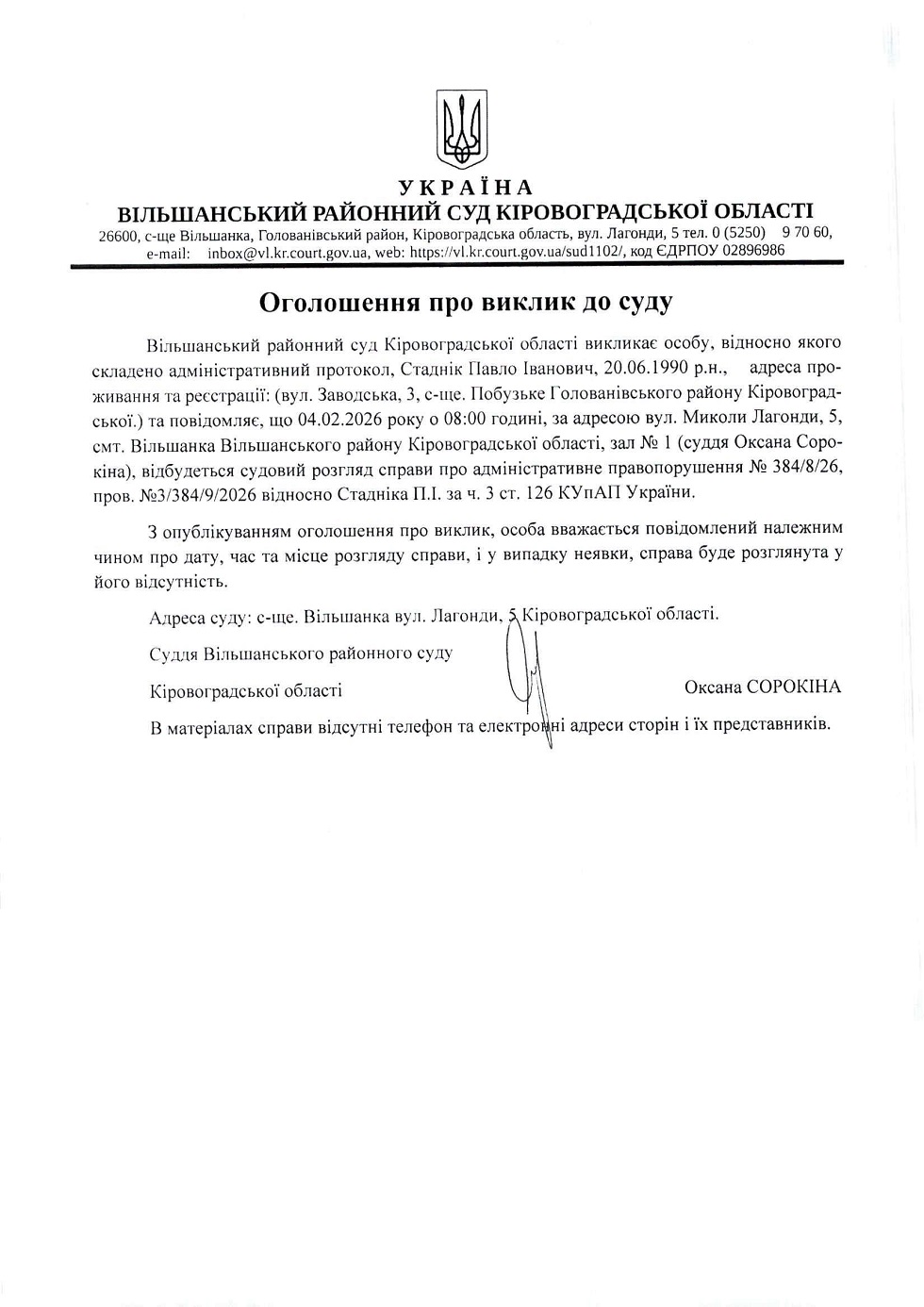 Оголошення про виклик до суду на 04.02.2026 Стадніка Павла Івановича справа № 384/8/25
