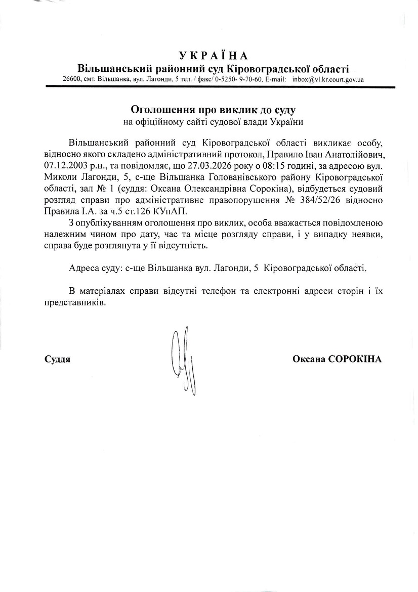 Оголошення про виклик до суду на 27.03.2026 Правила Івана Анатолійовича справа № 384/52/26